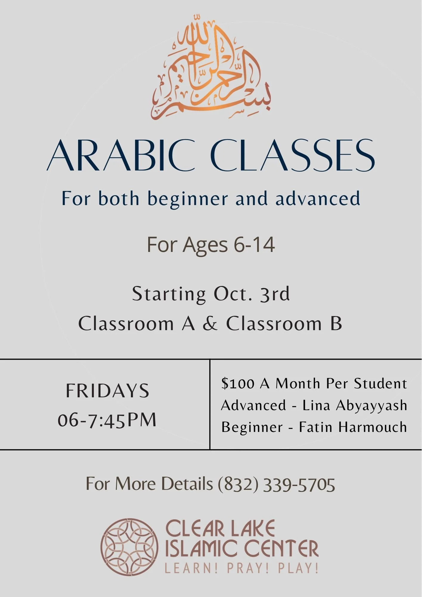 We’re excited to announce that our Beginner & Advanced Arabic classes for ages 6–14 are starting Friday, October 3rd, 2025, from 6:00–7:45pm in sha’Allah.