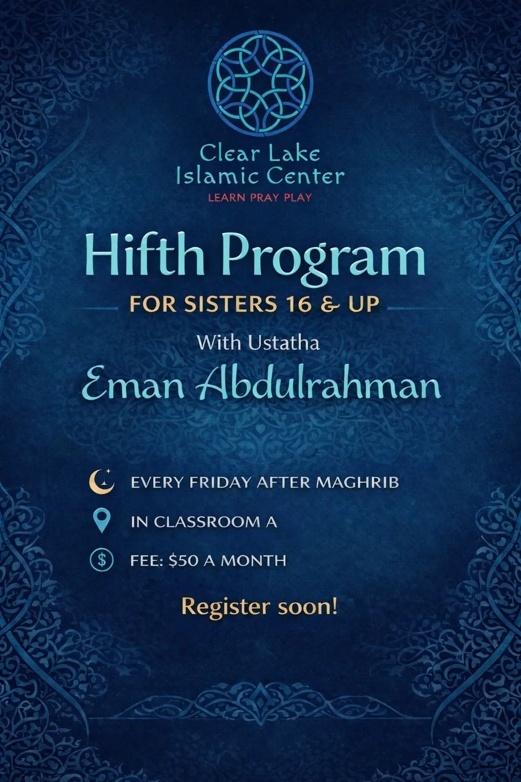 Clear Lake Islamic Center is pleased to offer a weekly Hifth program led by Ustatha Eman Abdulrahman, an experienced Qur’an teacher from Al Azhar.