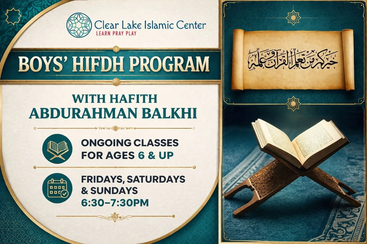 One of the best investments in this life is teaching your children Qur’an! Below is a link to register your young men in our Hifth Program, offered three times a week.