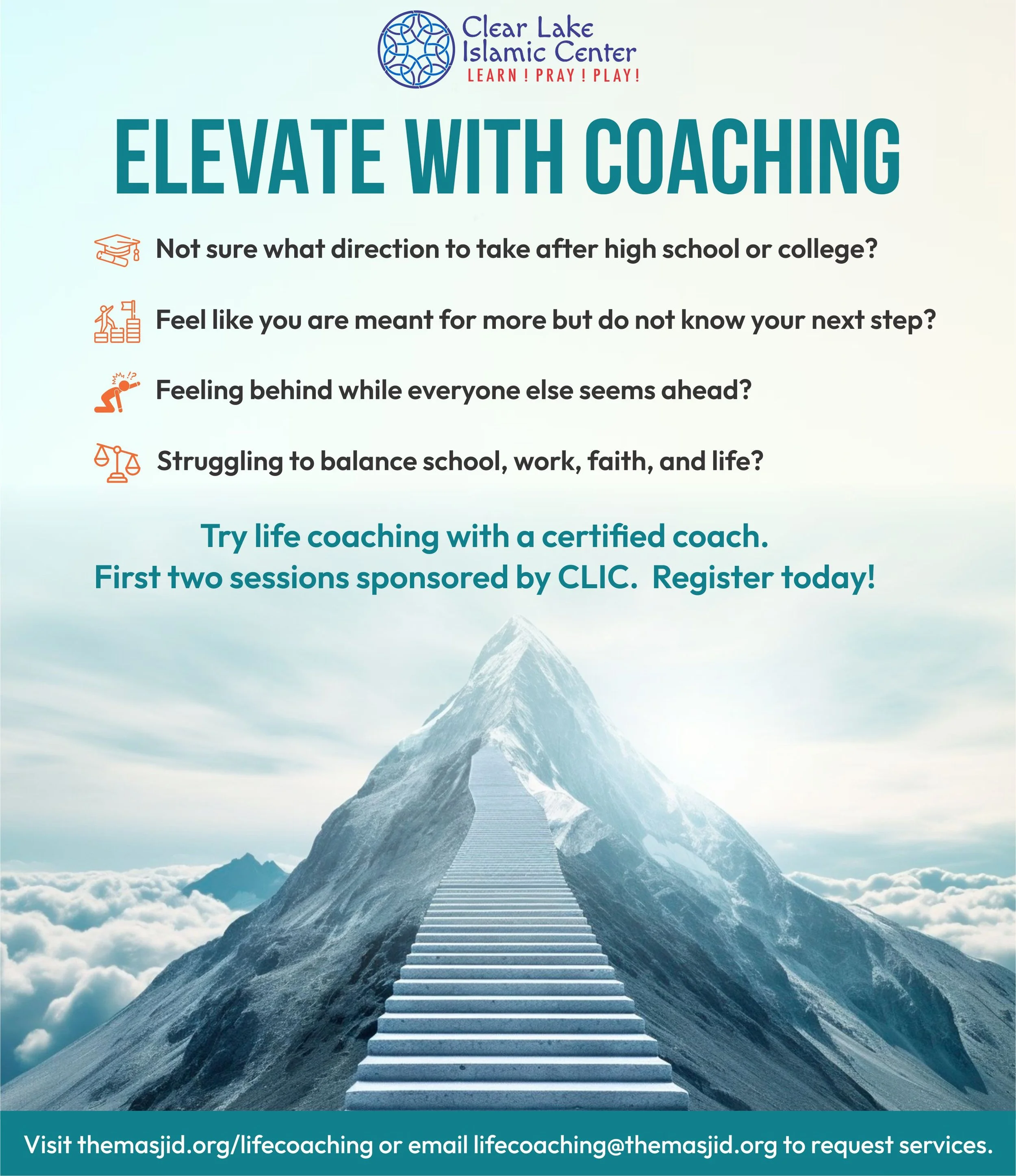 At Clear Lake Islamic Center, we care about helping you grow, stay focused, and build a life you’re proud of. That’s why we’re launching a coaching program That’s why we are launching Elevate with Coaching – a new initiative designed to guide you through life’s challenges and help you reach your goals with confidence.