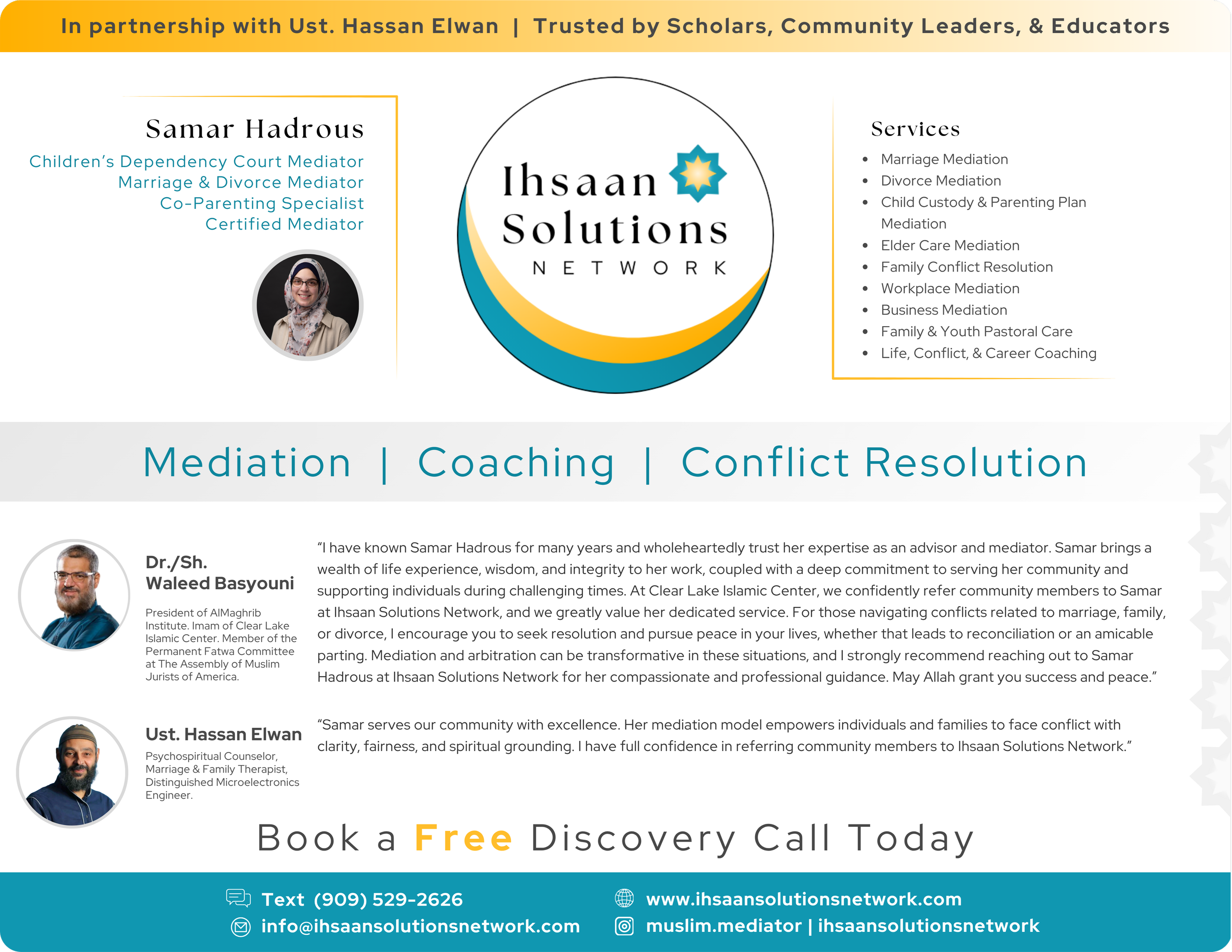 We can include Islamic scholars, attorneys, financial experts, and therapists, if needed during the process - but it's possible to go without.If both parties agree, Islamic elements of naseeha (advice) can be incorporated into a mix of joint and individual sessions.